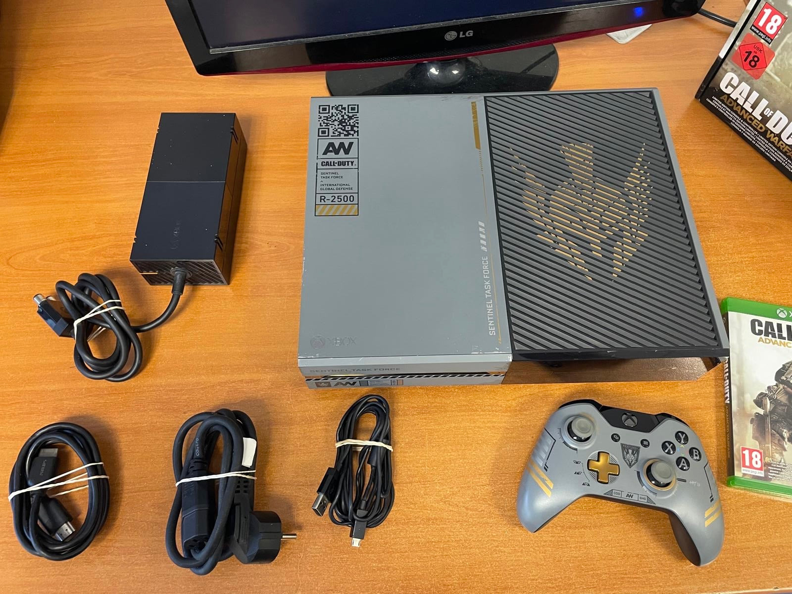 Console Xbox One édition spéciale Call of Duty Advanced Warfare (1 To), avec sa manette assortie et son jeu.